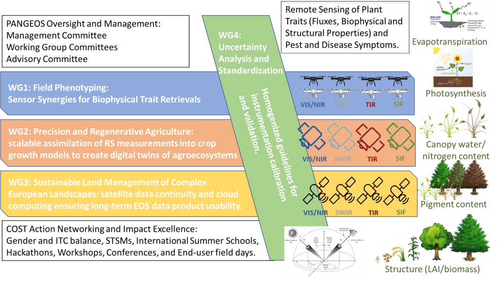 The sustainability of Europe’s green resources are threatened by climate change associated environmental changes. Agricultural systems and forests are among the ecosystems mostly interlinked with human health and wellbeing due to the socio-economic services they provide. Whether heat, drought, extreme weather, or biotic stressors, conventional agriculture and forestry today is unprepared for future climate scenarios, rising populations, changing consumption habits, and traditional management practices need re-thinking. The objectives set by PANGEOS are developed in the wake of the European Green Deal strategic goals. For agriculture, these include ensuring food security in the face of climate change, strengthening the EU food system’s resilience and reducing the environmental and climate footprint of the EU agricultural sector towards a competitive and sustainable use and management of resources. For forestry, these span the protection, restoration and enlargement of the EU’s forests to combat climate change, reversing biodiversity loss and ensuring resilient and multifunctional forest ecosystems. To support these goals, PANGEOS aims to leverage state-of-the-art remote sensing (RS) technologies to advance field phenotyping workflows, precision agriculture/forestry practices and larger-scale operational assessments for a more sustainable management of Europe’s natural resources. We propose to bridge the gap between state-of-the-art technologies and applied sciences, to directly serve and inform academics, Young Researchers and Innovators, Inclusiveness Target Countries and Near Neighbor Countries, end-users (e.g., farmers, foresters), and stakeholders in industry and policy-makers by bringing together RS experts and applications in (1) Field Phenotyping, (2) Precision and Regenerative Agriculture, (3) Sustainable Land Management of Complex European landscapes, and (4) Uncertainty Analysis and Standardization.